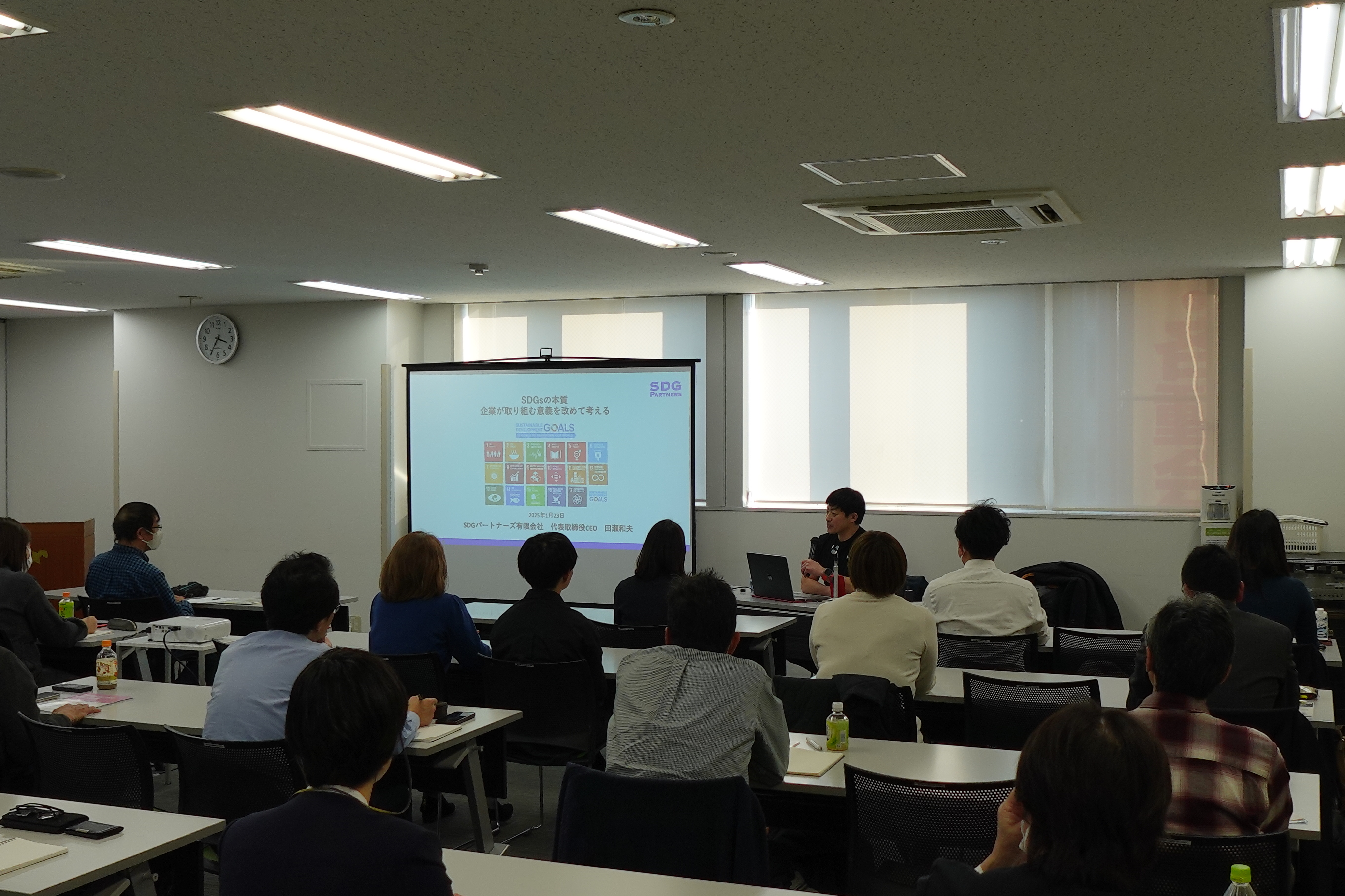 SDGパートナーズ有限会社の田瀬和夫氏を招いて、達成期限である2030年までの中間地点を過ぎ、後半戦に入った中で、改めて全体像と思想の把握、取り組む意義の認識、現在・未来の関わり方について講義をいただきました。